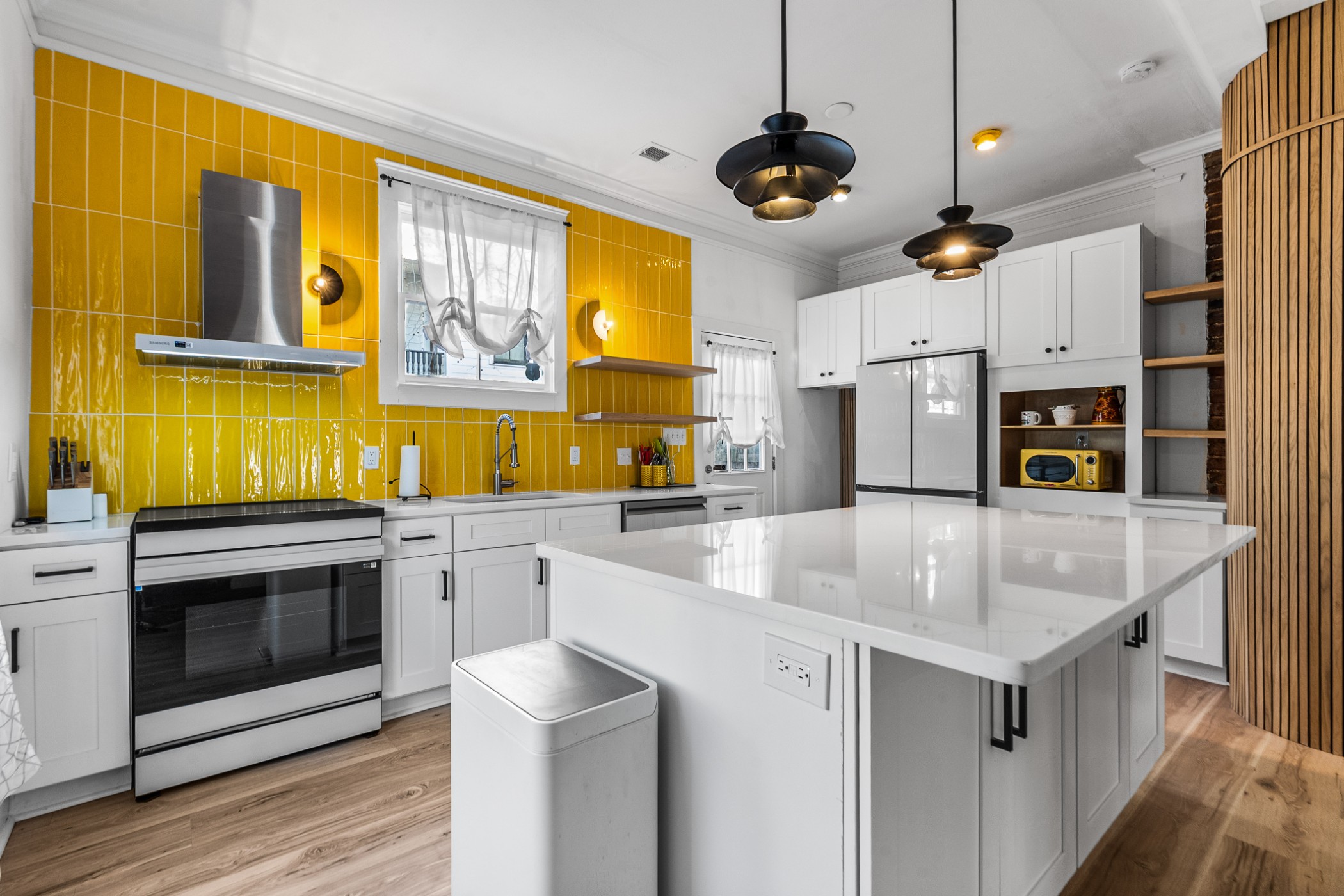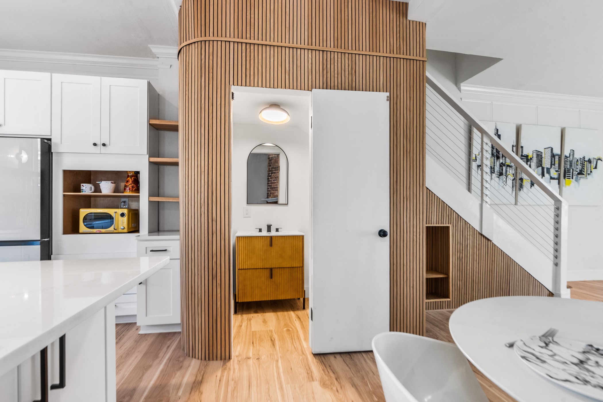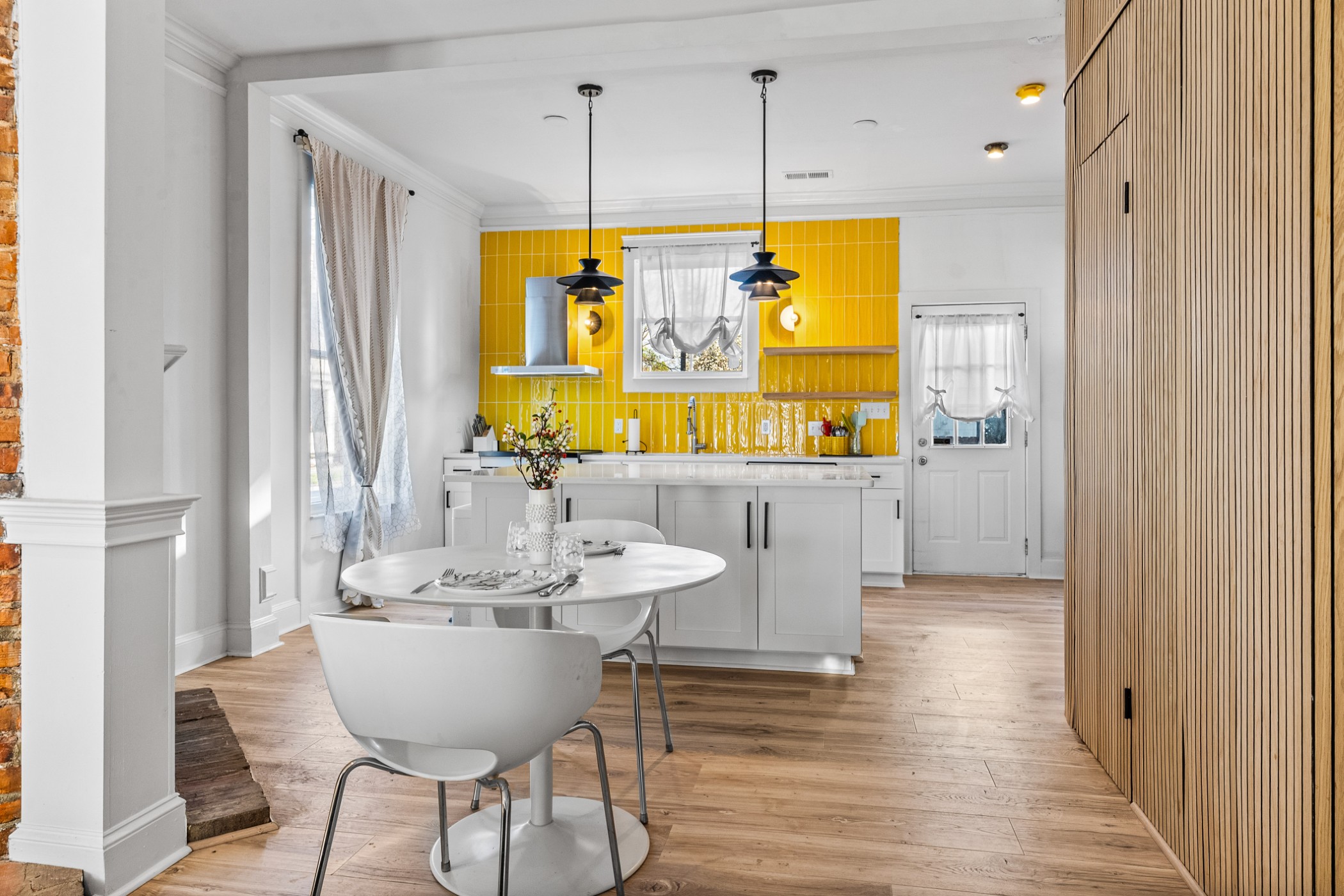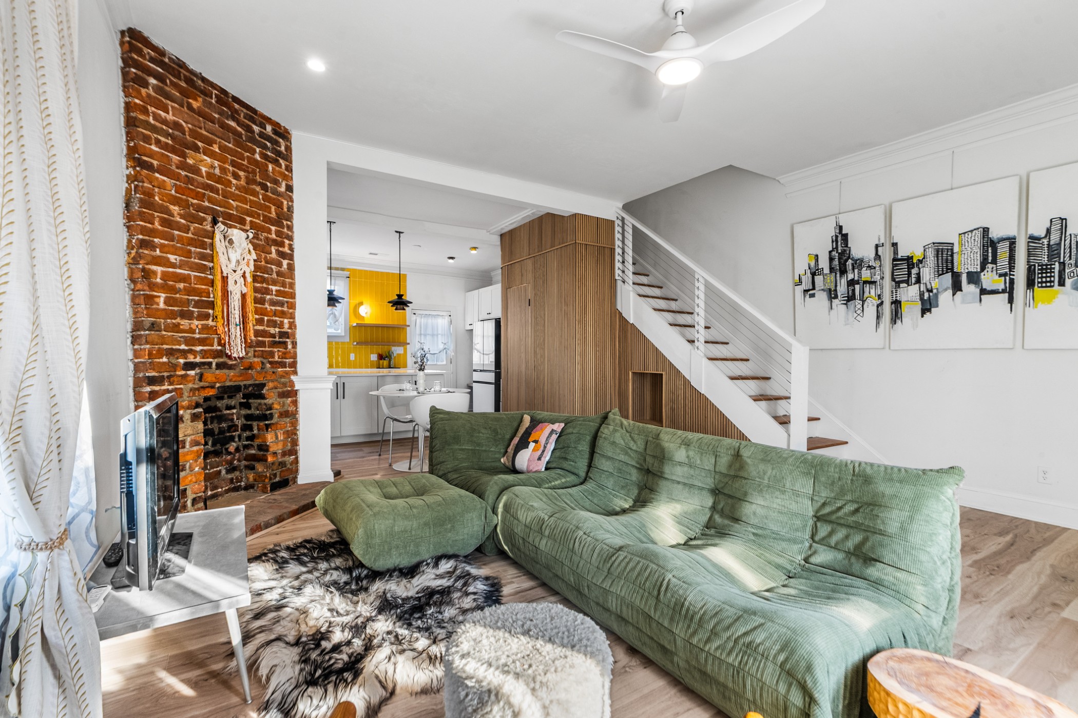 Bold, bright, and anything but cookie-cutter—this end-unit townhouse is a standout from the moment you walk inside. Exposed brick, clean lines, and curated finishes come together to create a space that feels both elevated and full of modern personality. At the heart of the home, the kitchen showcases undeniable character and makes an unforgettable impression. The main-level half bath is anything but an afterthought, showcasing a custom vanity and modern detailing that carry the home’s design throughout. Upstairs, two spacious bedrooms each feature updated en-suite bathrooms, where trendy design, glass enclosures, and thoughtfully selected finishes create spaces that are both functional and visually memorable. A private courtyard adds an outdoor element and creates an extension of the living space. Distinctive in design and thoughtfully executed throughout, this home offers a refreshing departure from the ordinary.